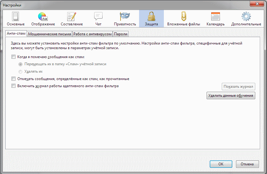 - Для антиспама. Удалять или перемещать спам в соответствующую папку, отмечать как прочитанные. Предусмотрен адаптивный обучающийся фильтр, сортирующий последующую корреспонденцию на основании действий пользователя.