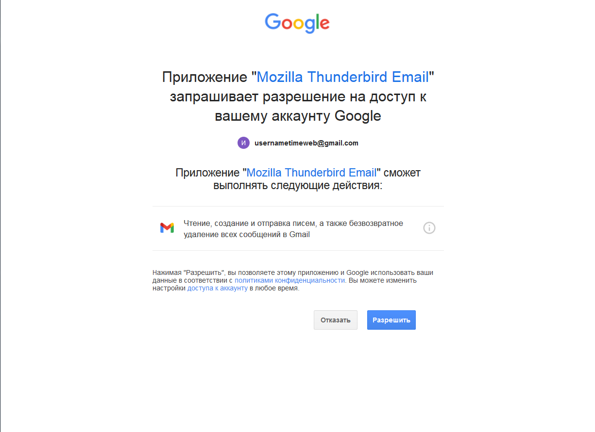 - В Mozilla Thunderbird создать учетную запись Gmail, указав те же данные и разрешив приложению доступ к аккаунту.