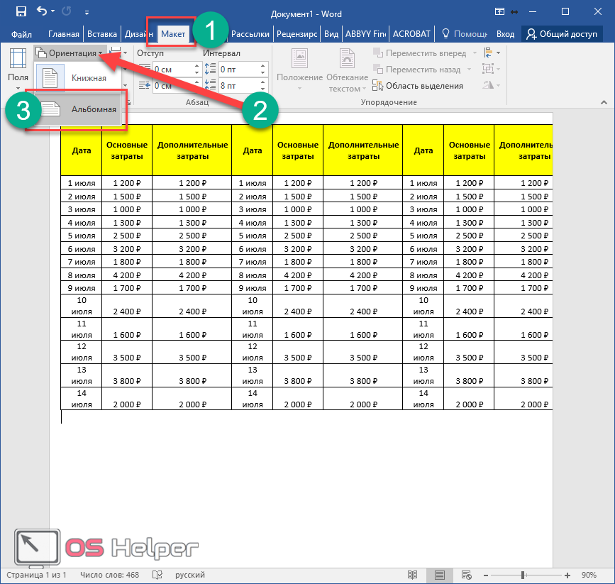 - Но если и этого будет недостаточно, остается только один вариант. Для того чтобы изменить ориентацию документа, необходимо перейти на вкладку «Макет», кликнуть на кнопку «Ориентация» и выбрать пункт «Альбомная».