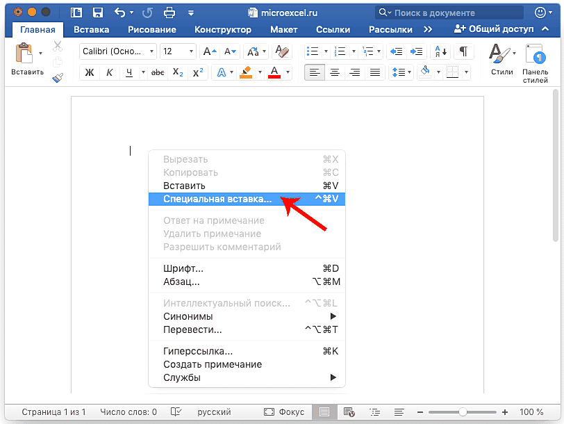 - Далее жмем ПКМ. На дисплее возникло небольшое контекстное меню. Находим элемент, имеющий наименование «Специальная вставка…», и жмем по нему левой клавишей мышки.
