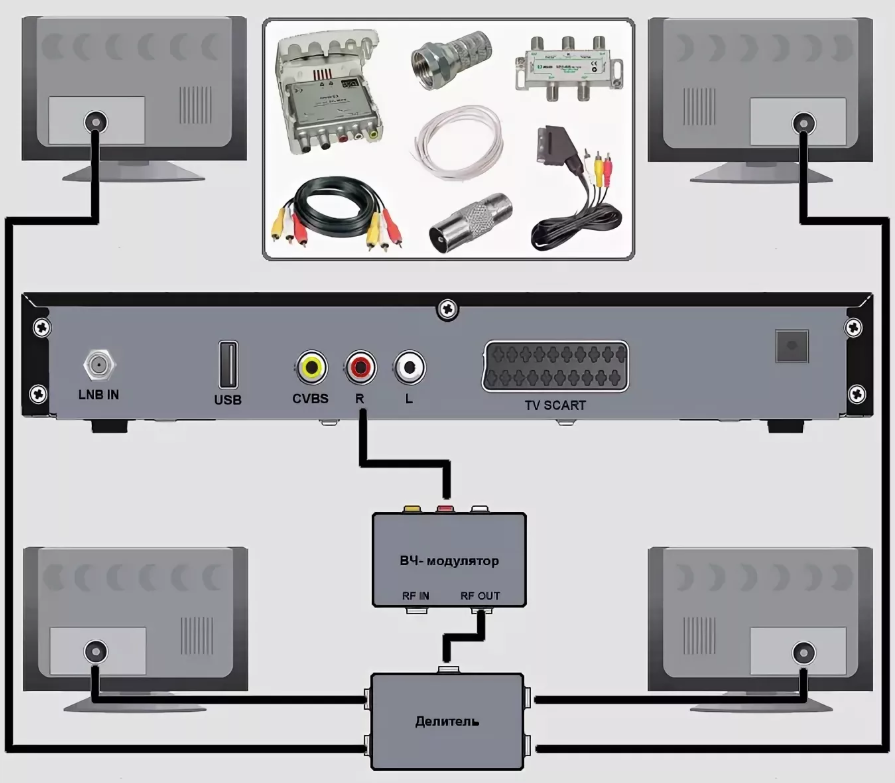 Также можно использовать несколько девайсов для модулирования и разветвления сигнала. Для этого нужно приобрести модулятор высоких частот и делитель.
