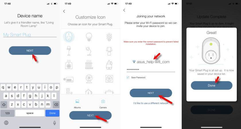 Дальше пойдет проверка подключения к розетке и появится окно где нужно задать имя для нашей розетки и выбрать иконку (можно сделать свое фото). После чего нужно выбрать Wi-Fi сеть нашего роутера (скорее всего она будет выбрана по умолчанию) и указать от нее пароль. Чтобы розетка смогла подключится к интернету. Возможно, после подключения она предложит обновить прошивку – соглашайтесь.