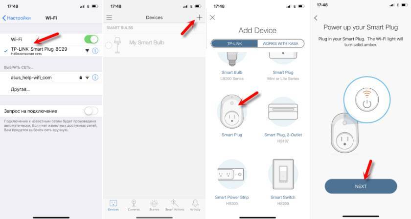 После чего на телефоне заходим в настройки Wi-Fi и подключаемся к Wi-Fi сети, которую будет транслировать розетка (пока мы ее не настроим). Сеть без пароля. После подключения к розетке открываем приложение Kasa и нажимаем на кнопку “+” (добавить устройство). Дальше выбираем тип устройства “Smart Plug” и нажимаем “Next”.