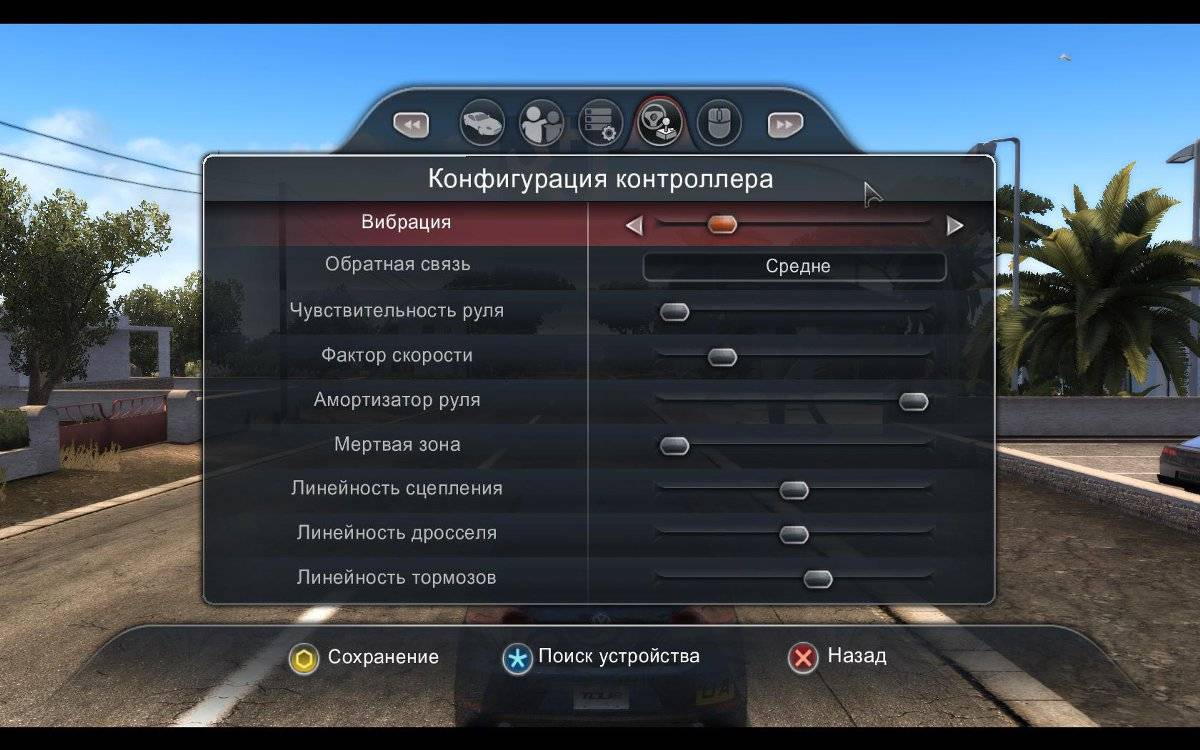 Делается это непосредственно в автомобильном симуляторе: в меню «Настройки» должен быть специальный раздел, посвященный регулированию параметров подключенного контроллера.