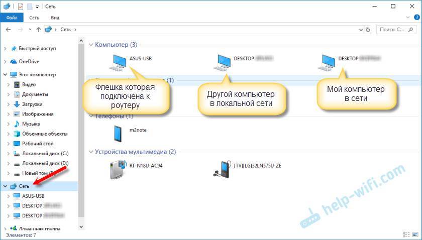 Показываю на своем примере. В разделе “Сеть” у меня отображается мой компьютер, еще один компьютер, который находится в сетевом окружении и USB-накопитель, который подключен к моему маршрутизатору.