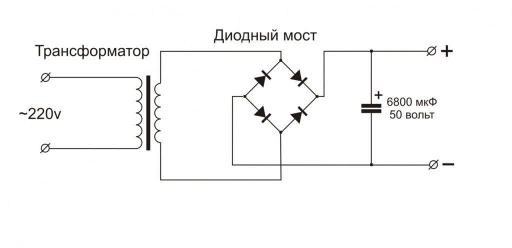 - Затем вам надо будет подключить вывода с трансформаторного устройства к сооруженному диодному мосту. Один контакт от устройства следует подсоединить к контакту плюс-минус на мосту, второй контакт аналогично подключается к такому же выводу. На данном этапе контакты плюс-плюс, а также минус-минус еще свободны.