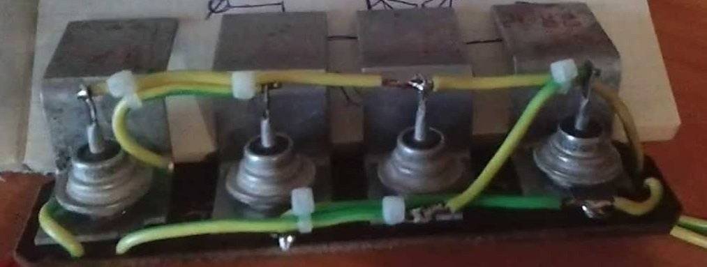 - После этого вам потребуется две спайки или скрутки из диодов соединить друг с другом. При подключении положительный вывод на одной из спаек необходимо соединить с положительным выводом на другой спайке. Аналогичным образом поступите с отрицательными контактами — минус одной спайки подсоединяется с минусом другой. Так вы сделали диодный мост.