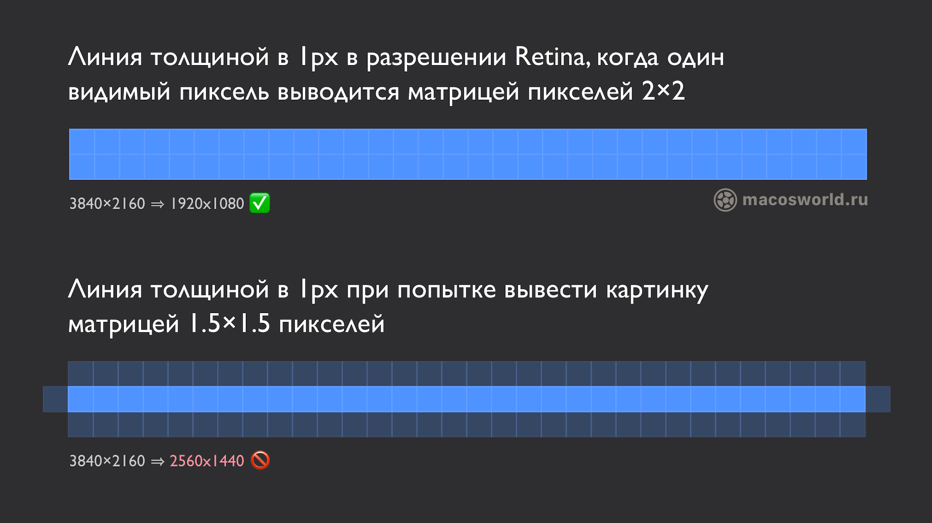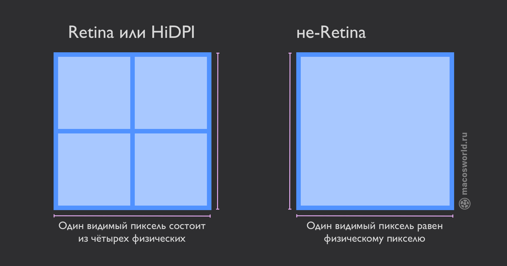 Когда видимая картинка в два раза меньше физического разрешения монитора, то один видимый пиксель состоит из четырёх физических пикселей. Такое изображение называют изображением высокой чёткости, или HiDPI. У Apple для этого своё маркетинговое название — Retina.