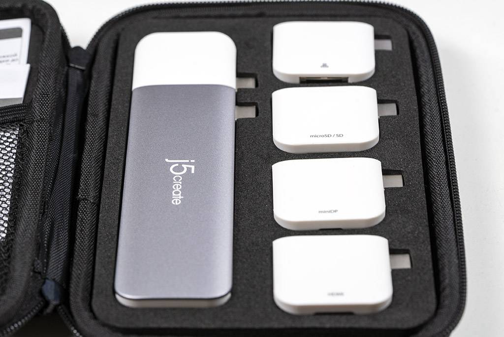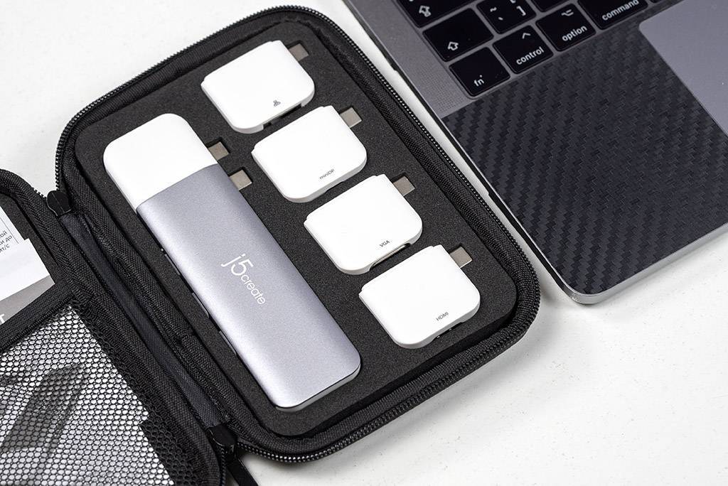 В комплекте с алюминиевой основой идут 5 отдельных модулей с магнитным креплением. Все вместе можно комбинировать 12-ю разными способами для самых разных задач, от резервного копирования до зарядки макбука и подключения нескольких дополнительных мониторов.