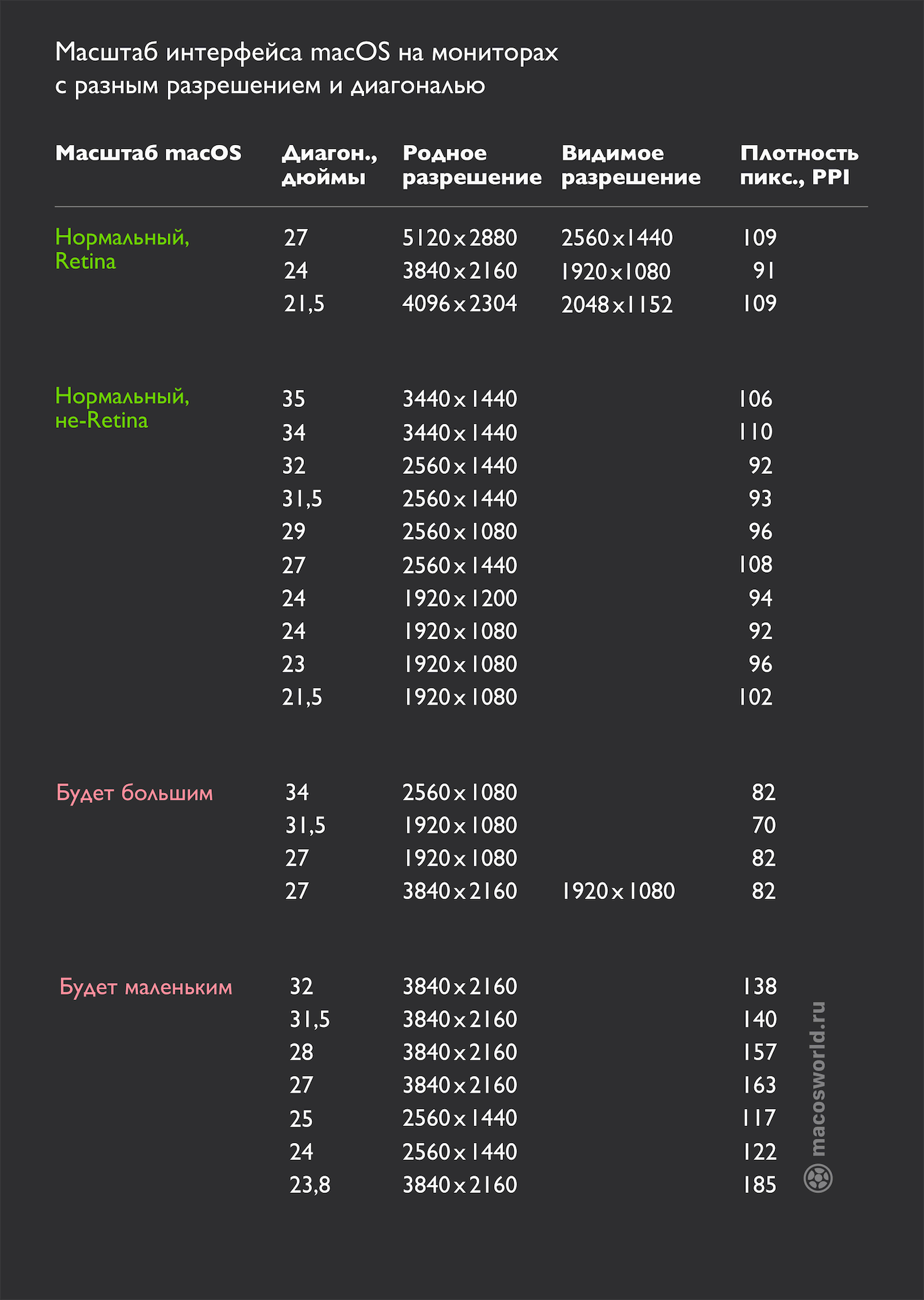 ️ Интерфейс macOS выглядит хорошо, когда видимая плотность пикселей (PPI) находится в районе 110.