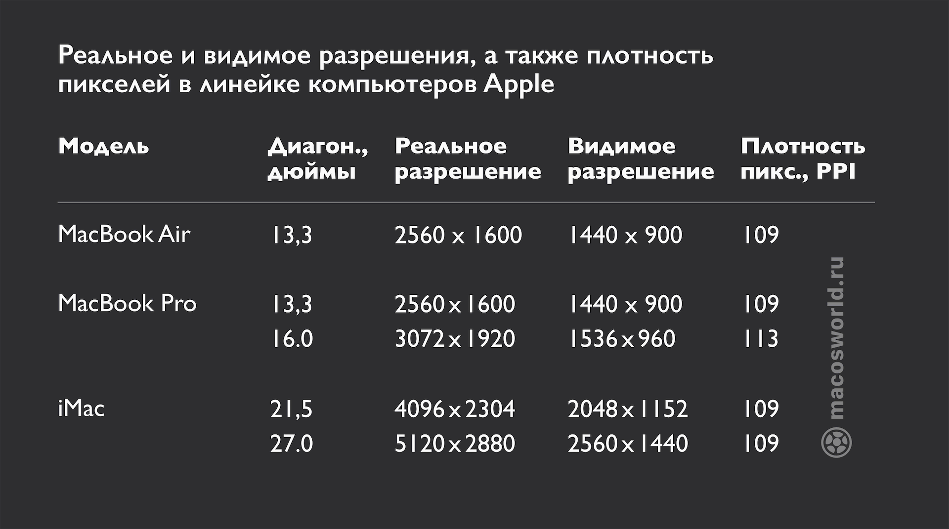 Чтобы macOS одинаково хорошо выглядела на устройствах с разной диагональю и разрешением, Apple привязал размер интерфейса macOS к параметру PPI (Pixels Per Inch) — количеству пикселей на дюйм, которое можно вычислить из диагонали и разрешения экрана.