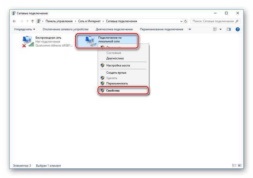 Щелкните ПКМ по блоку LAN-подключения и выберите строку «Свойства».