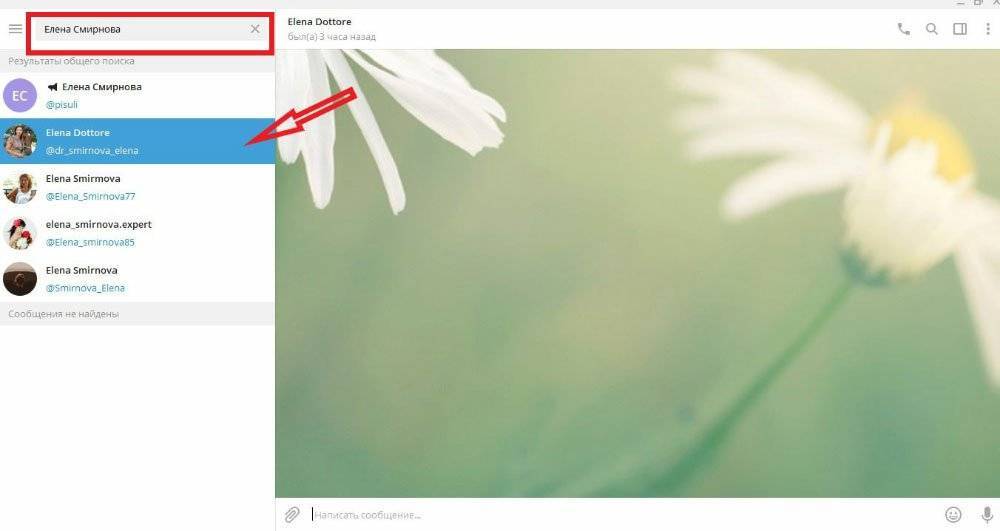Откройте Telegram. В поиск введите имя пользователя или его ник через символ «@». Вы должны точно знать, как он записан в мессенджере;