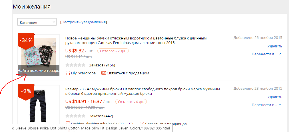 После этого переходим в «Мои желания» и находим свежезакинутую вещь. При наведении курсора на изображение товара появляется шторка «Найти похожие товары».