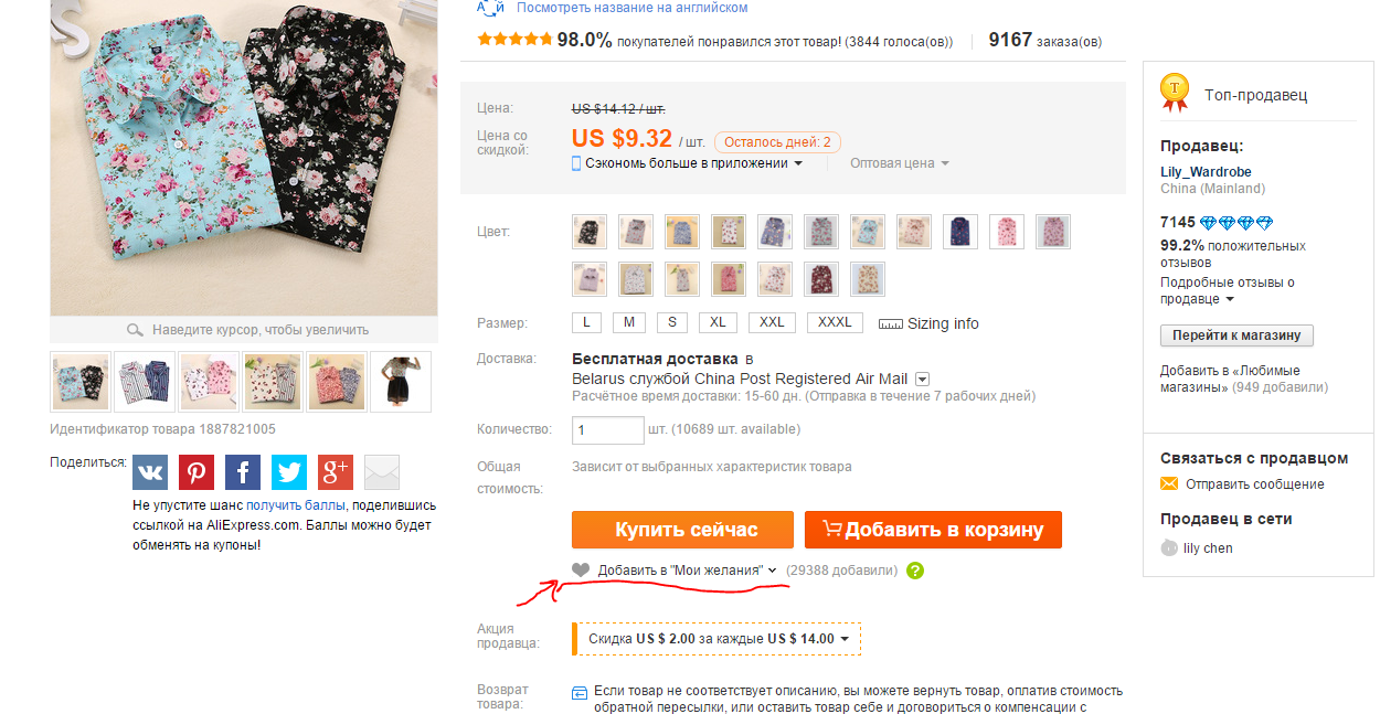 2. Открыв понравившийся товар, жмем кнопку «Добавить в мои желания».