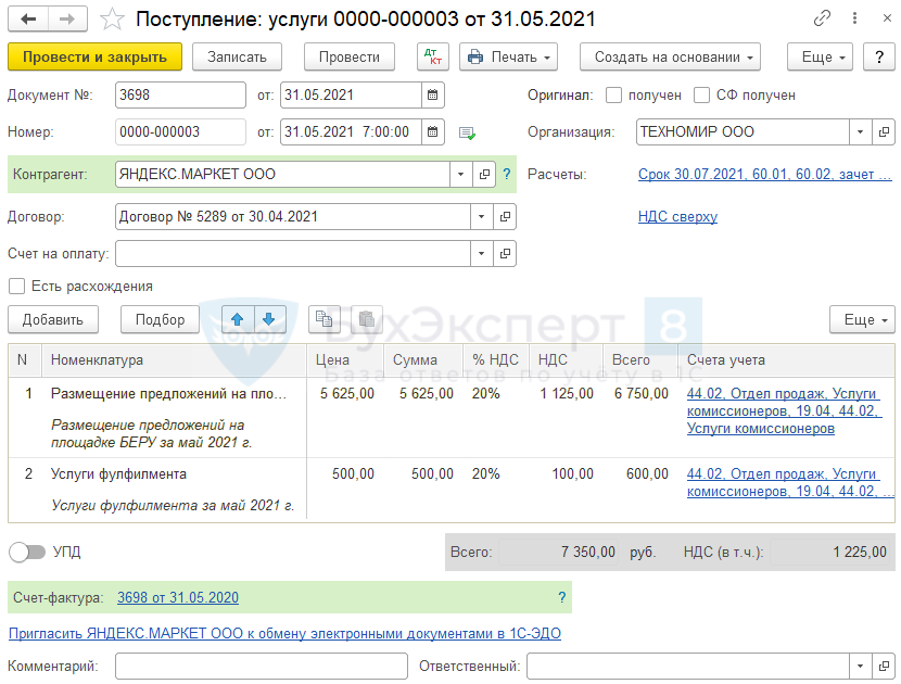 Аналогичным образом оформляются в 1С услуги фулфилмента и размещения информации о товарах на сайте «Беру» (Яндекс.Маркет).