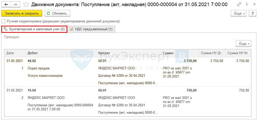 Если в документе установлен флажок Отразить вычет НДС в книге покупок датой получения, то при его проведении будут сделаны проводки по принятию НДС к вычету.