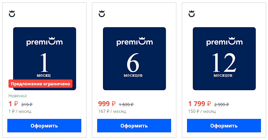 Чтобы получить премиум-статус, нужно купить подписку на срок 1 или 12 месяцев. Цена за месяц получается самой низкой при покупке годовой подписки. От подписки можно отказаться в любой момент, деньги за неиспользованные месяцы возвращаются обратно.