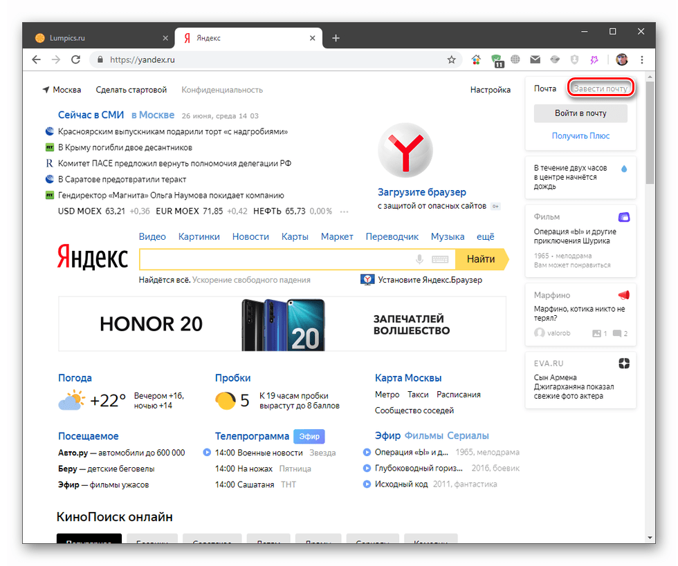 Стать владельцем Диска на Яндексе может каждый. В том случае, если у вас нет почты на Yandex, ее необходимо создать. Все предельно просто – заходите в одноименный поисковик и в правом верхнем углу находите надпись “Завести почту”.