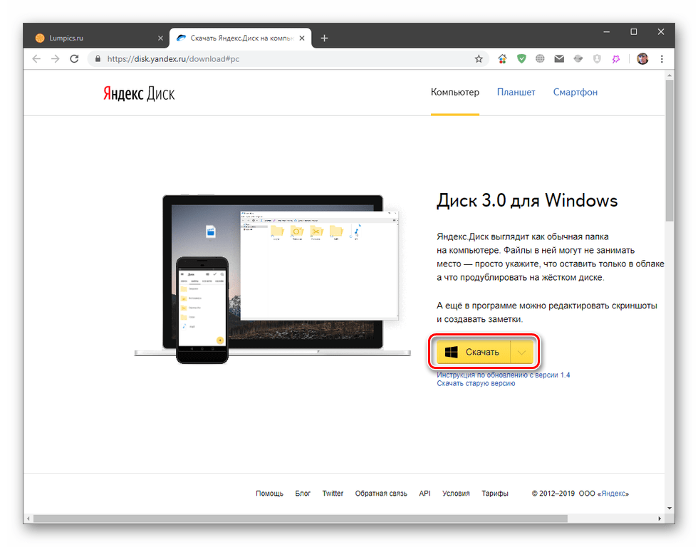 Нажмите на кнопку «Установите Яндекс Диск для Windows» и загрузите программу на компьютер.