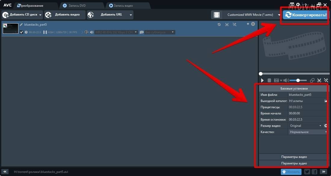 Указываем все настройки в панелях Базовые установки, Параметры видео и Параметры аудио, после чего жмем кнопку Конвертировать: