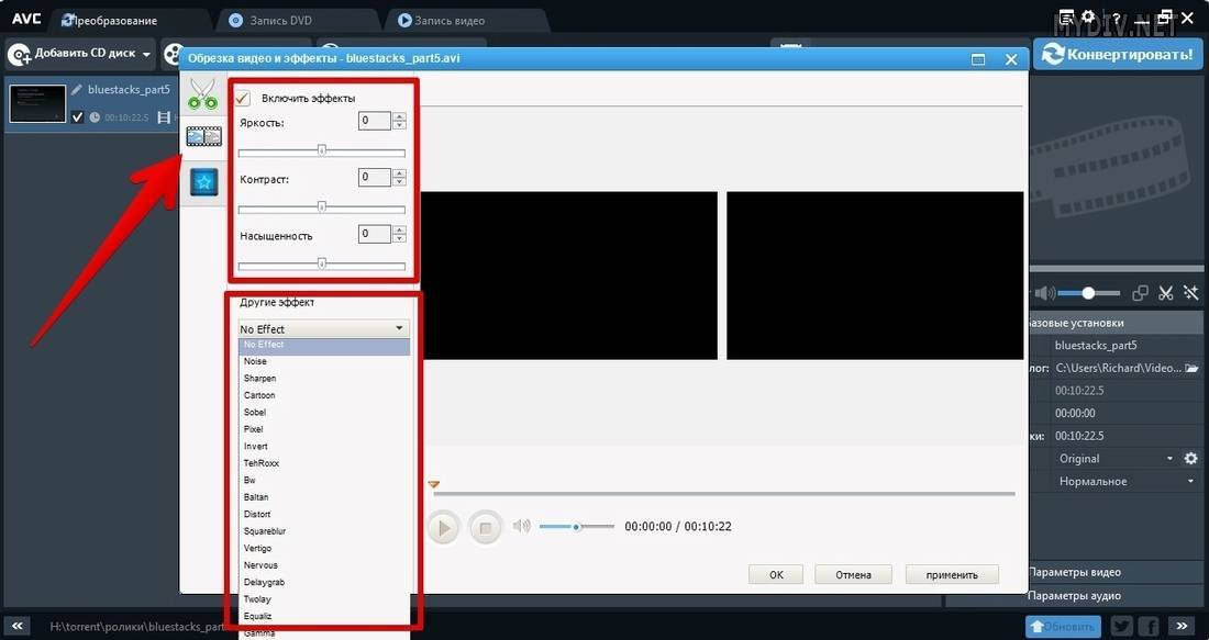 Чтобы добавить спецэффект, необходимо перейти во вторую вкладку с названием «Видеоэффекты», где в разделе «Другие эффекты» выбрать желаемый фильтр, подтвердить его применение после предварительного просмотра результата, если он удовлетворяет исполнителя. Советовать в направлении, какие лучше выбирать эффекты, более чем бессмысленно, так как здесь всё зависит от предпочтений исполнителя, фантазии и требований к финальному видео. Параллельно, в этой же вкладке, можно задать параметры насыщенности видео, контрастности и яркости. Перед сохранением результативного файла потребуется повторно выполнить манипуляции, касающиеся преобразования видео: задать базовые настройки и конвертировать объект.