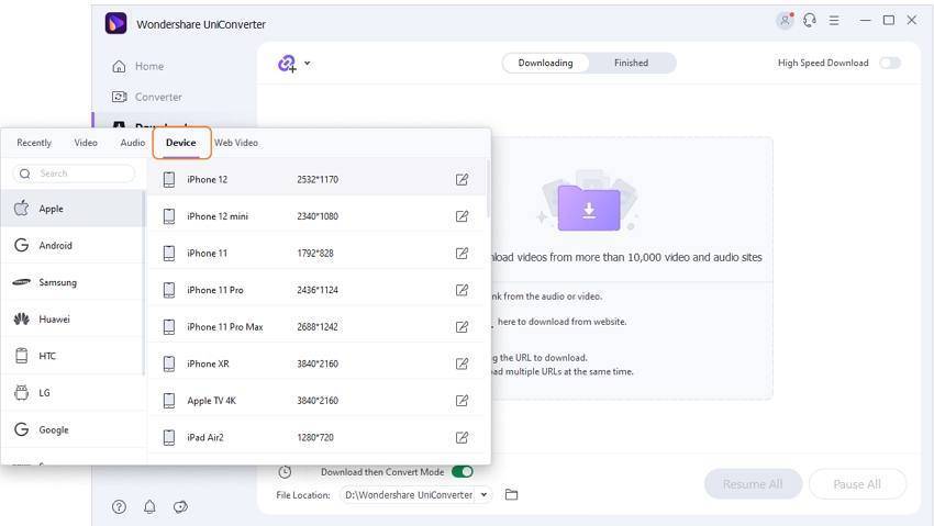 затем выберите вкладку «Video», «Audio» или «Device» вместе с желаемым форматом вывода, а также уменьшите разрешение.