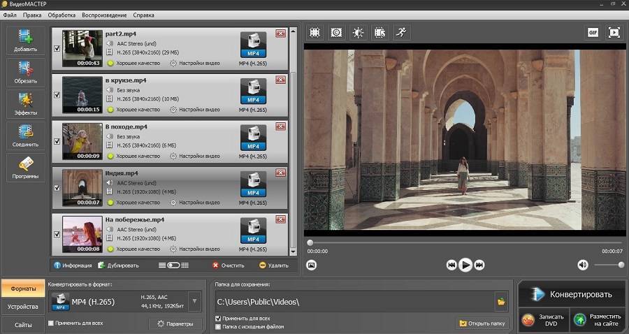 ВидеоМАСТЕР — мощный видео конвертер с возможностью редактирования видео файлов, работающий на русском языке. ВидеоМАСТЕР конвертирует видео в большое количество форматов, в том числе для мобильных устройств с готовыми настройками. В программу встроен видео редактор, поддерживается пакетное преобразование видео файлов, возможна нарезка видео на отдельные фрагменты, озвучивание видео файла, извлечение аудиодорожки из видео и т. д.