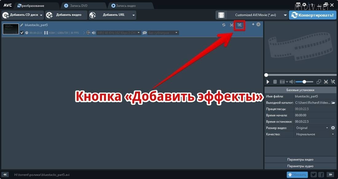 Функциональность программы позволяет не только конвертировать видео в нужный формат, но и обработать предварительно файл, к примеру, преобразовав его с помощью спецэффектов. В качестве функции, отвечающей за спецэффекты, выступает пиктограмма в виде волшебной палочки на панели проигрывателя, открывающая инструменты для обрезки файла и создания эффектов. Вопрос, как работать в Any Video Converter с этими инструментами, имеет больше риторический, чем практический характер, так как процесс применения эффектов является интуитивно понятным и несложным в исполнении. После активации пиктограммы пользователю откроется три вкладки, где можно задать эффект, выполнить обрезку по краям, осуществить зеркальное отображение видео или его поворот на нужный угол, добавить логотип или текстовое сопровождение.