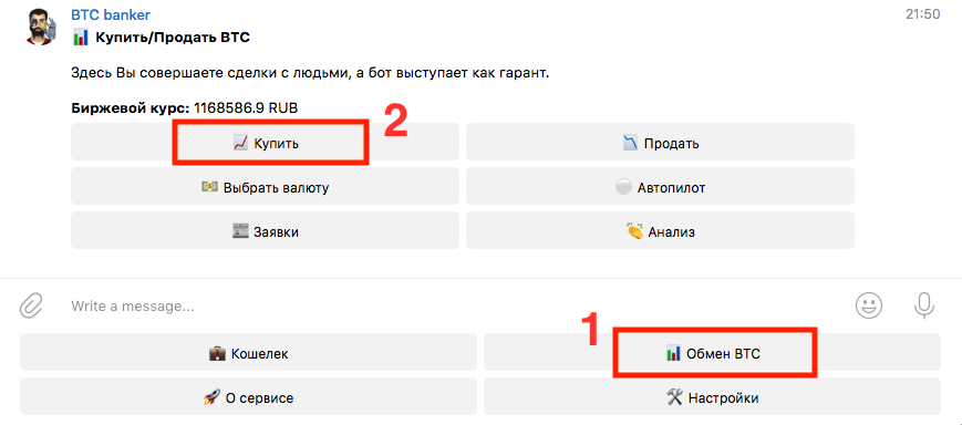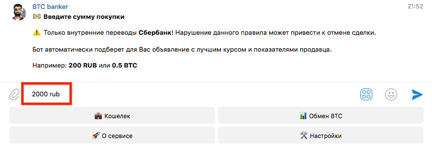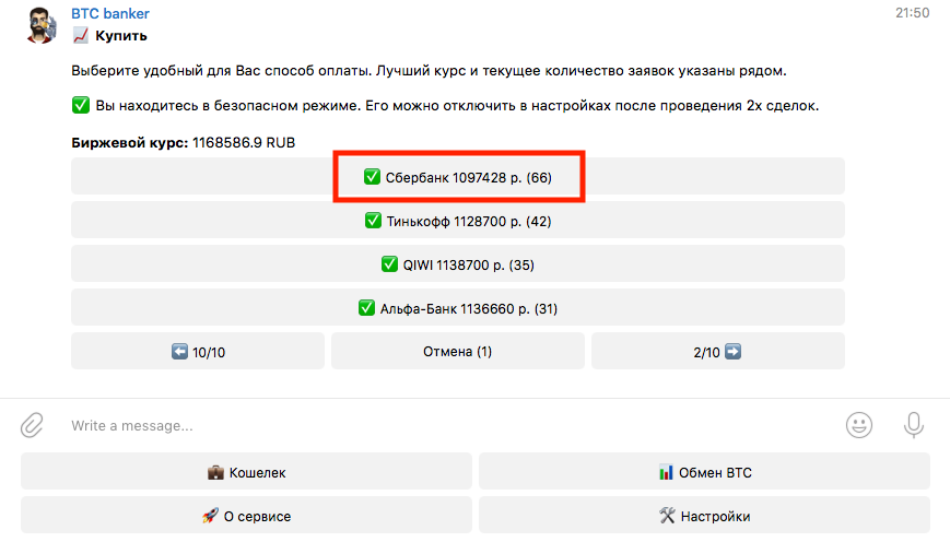 С продажей все так же просто — заходим в «Обмен BTC», нажимаем «Продать» и выбираем способ оплаты. Бот так же подберет для вас предложение с самой высокой ценой. При первой продаже бот запросит у вас указать номер карты или счета, куда контрагенту нужно перевести рубли.