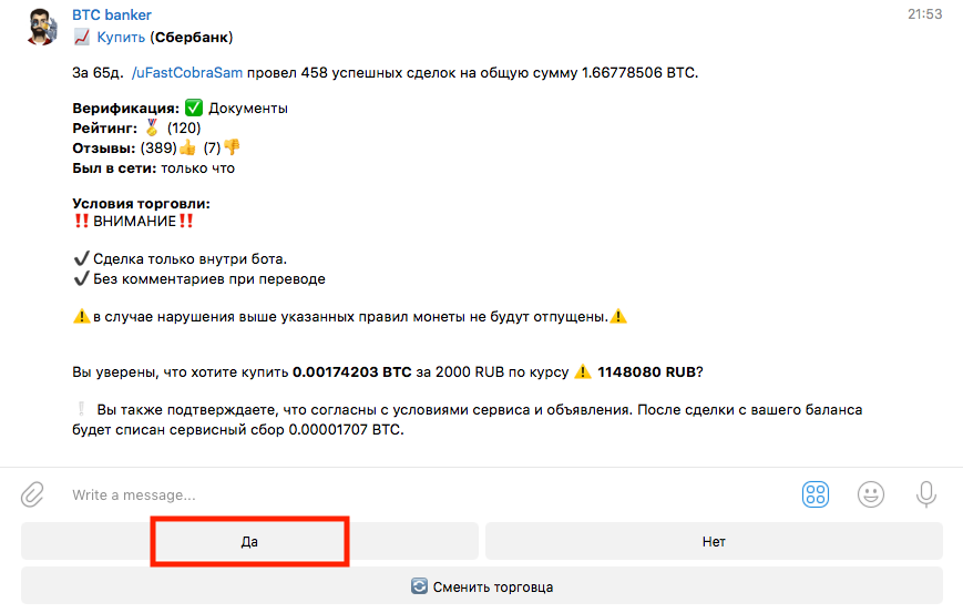 Шаг 4. Бот автоматически предложит вам предложение с наиболее выгодным курсом, а также информацию о трейдере и условия сделки. Вы можете согласиться, нажав кнопку «Да» или посмотреть другие предложения, нажав «Сменить торговца».