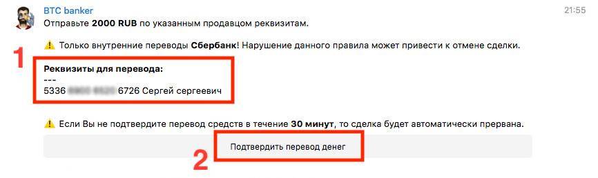 Шаг 5. После начала сделки от продавца придут реквизиты, на которые следует отправить деньги. Бот заморозит его монеты до окончания сделки, чтобы избежать мошенничества. Мы отправляем необходимую сумму через Сбербанк.Онлайн и нажимаем «Подтвердить перевод денег».