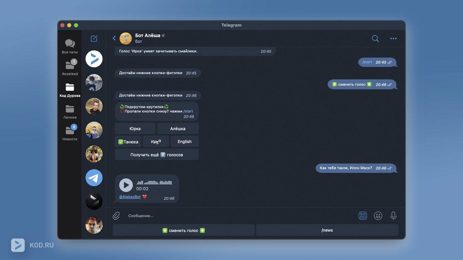 Бот работает при поддержке нескольких движков синтеза речи и, при желании, Бота Алёшу можно подключать к Telegram-чатам. Внутри: Юрка, Алёшка, Танюха и Ира. Последняя способна зачитывать смайлики. Дополнительные 8 голосов можно получить после доната.