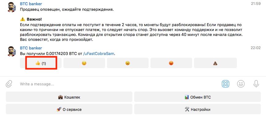 Вот и все. Вы купили биткоины в сервисе. Теперь вы можете перевести их на другой кошелек, продать их или подарить, выписав чек. Покупка биткойна, вместе с настройкой бота заняла примерно 3 минуты.