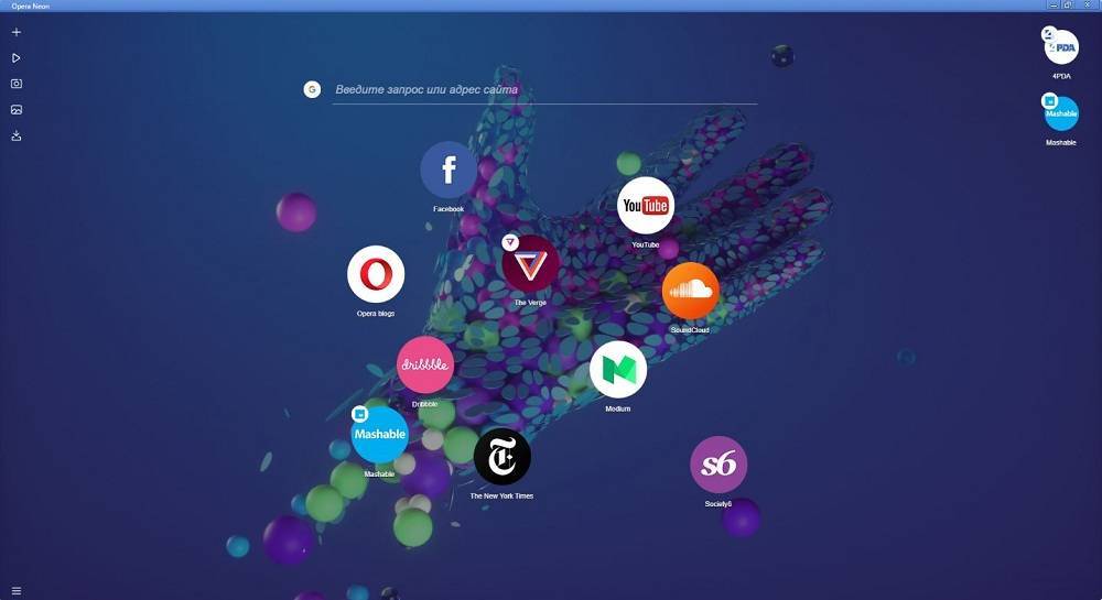Каждый сайт открывается в отдельном “окне”, расположенном по центру страницы, при этом остаются свободные полосы по краям экрана — с левой стороны остается панель кнопок, справа — миниатюры открытых страниц. В Opera Neon нет привычной панели вкладок — каждая страница, потерявшая фокус, сворачивается в пиктограмму, расположенную в боковой панели. Нет там и “Избранного” — при необходимости сделать закладку иконка с правой колонки перемещается в центральную часть экрана, там наиболее часто используемые сайты будут автоматически перемещаться вверх.