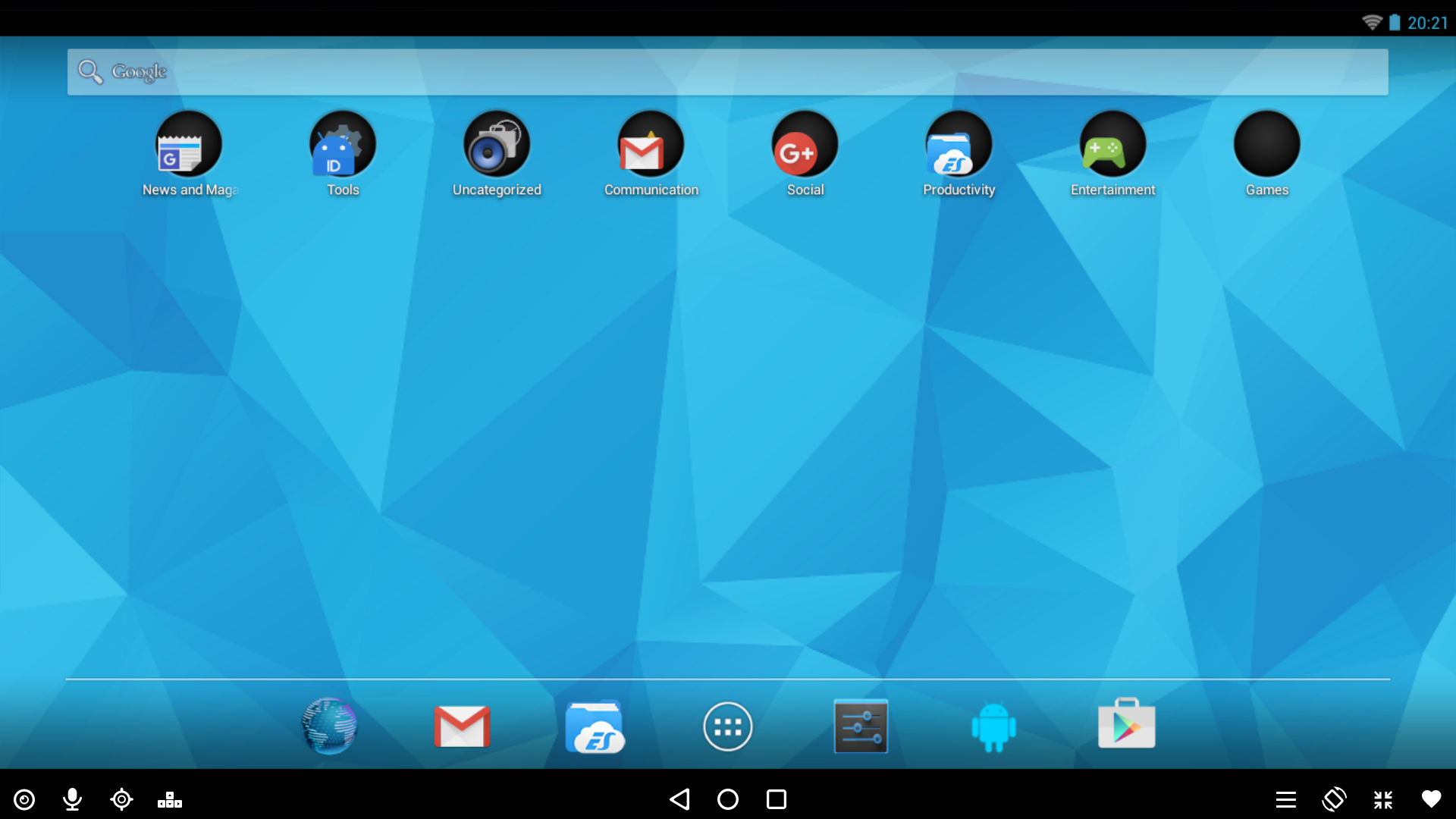 Довольно интересный и быстрый андроид эмулятор. По статистике он показывает, что 99% всех приложений отлично запускается при взаимодействии с ним. Чтобы скачать в него игры и приложения воспользуйтесь Google Play. Стоит учитывать, что экран эмулятора отображает только латинские буквы. Работает на Андроид 4.4.2.