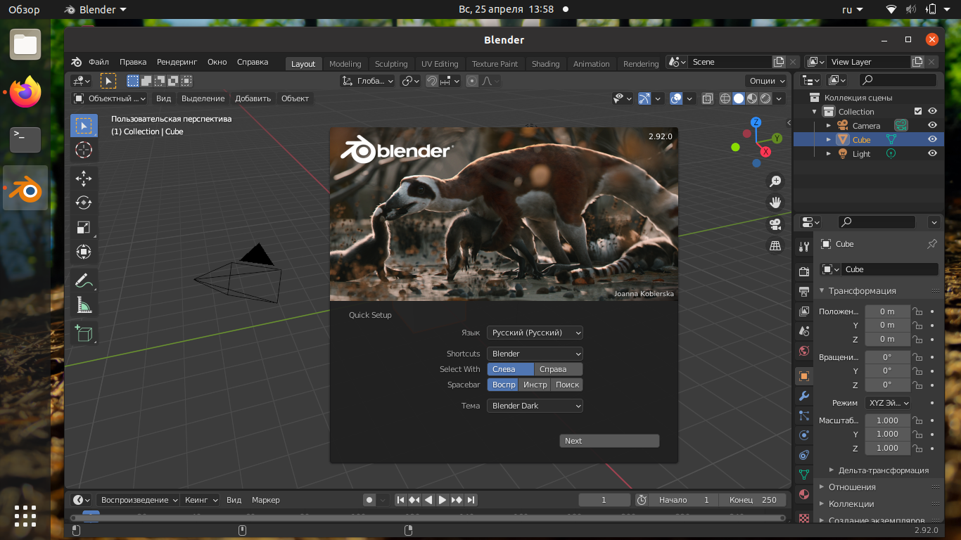 - Чтобы в последующем нам были доступны все возможности видеоредактора, мы устанавливаем программу Blender. Для этого введите в терминале следующую команду: sudo apt-get install blender