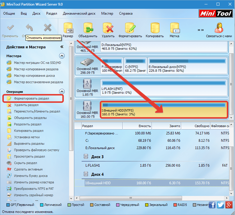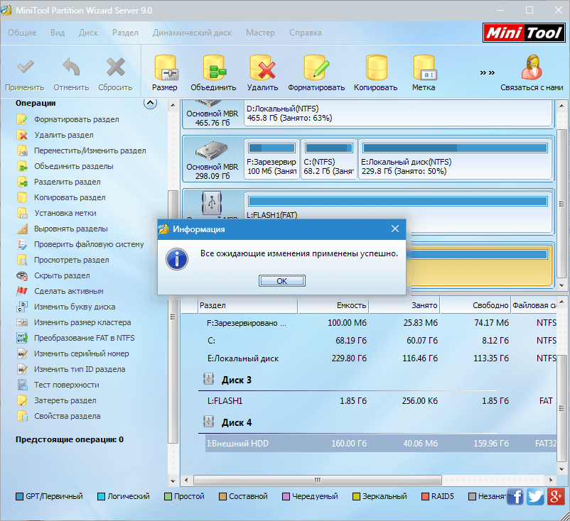 Для применения изменений можно воспользоваться программой, имеющей большие функциональные возможности – MiniTool Partition Wizard Home Edition. Утилита бесплатная, она позволяет создавать разделы диска или изменять уже существующие, форматировать и выполнять конвертацию. Список совместимых файловых систем достаточно большой: FAT, NTFS, EXT (а также Linux swap). Поддерживается работа с дисками до 2 Тб.