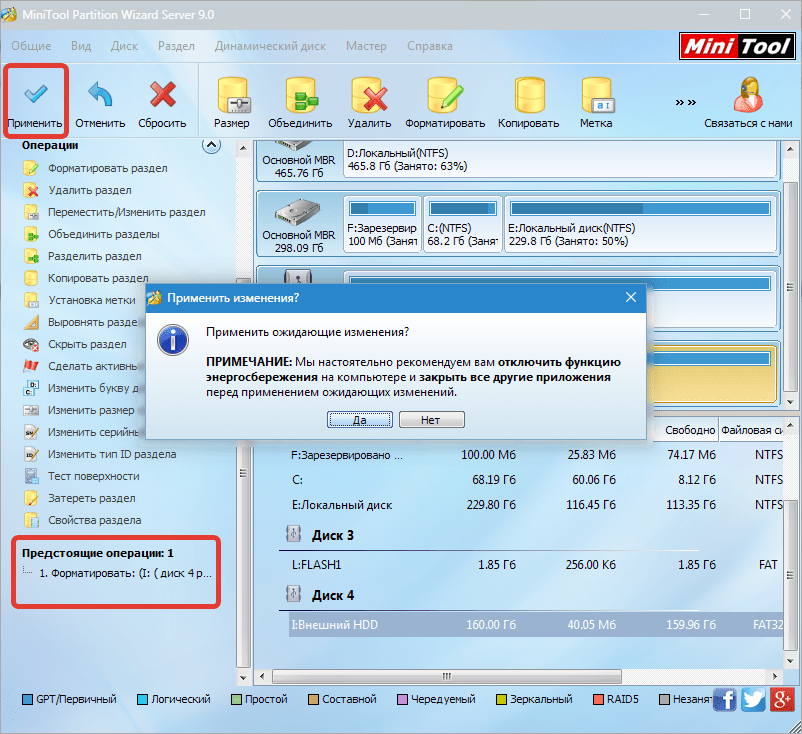 3. Операцию мы запланировали, теперь нажимаем «Применить». В открывшемся диалоговом окне содержится важная информация о том, что нужно отключить энергосбережение, поскольку если операция прервется, то с диском могут возникнуть проблемы.
