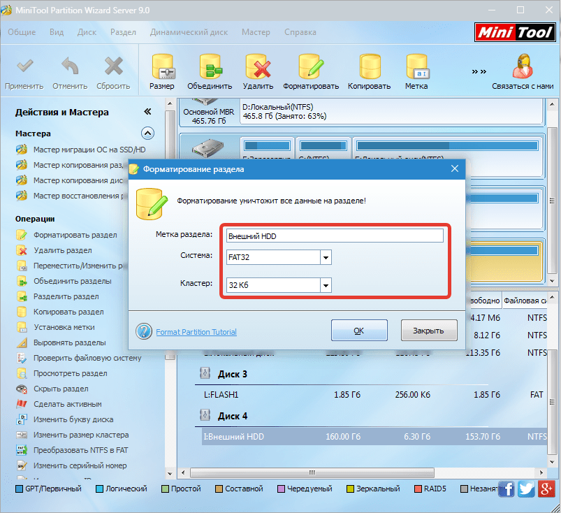2. В открывшемся диалоговом окне можно изменить метку диска, файловую систему и размер кластера. Метку оставим старую, файловую систему выберем FAT32 и размер кластера 32кБ (для диска такого объема подойдут именно такие кластеры).