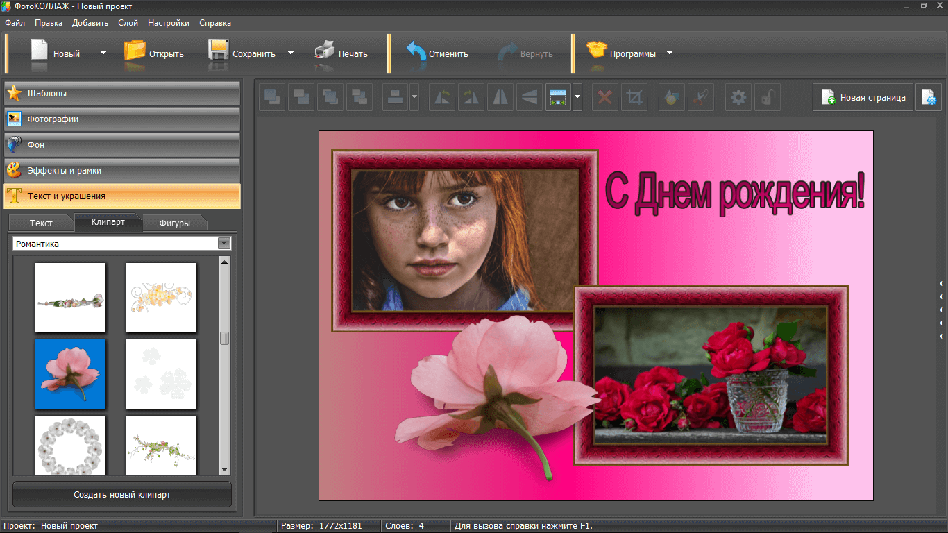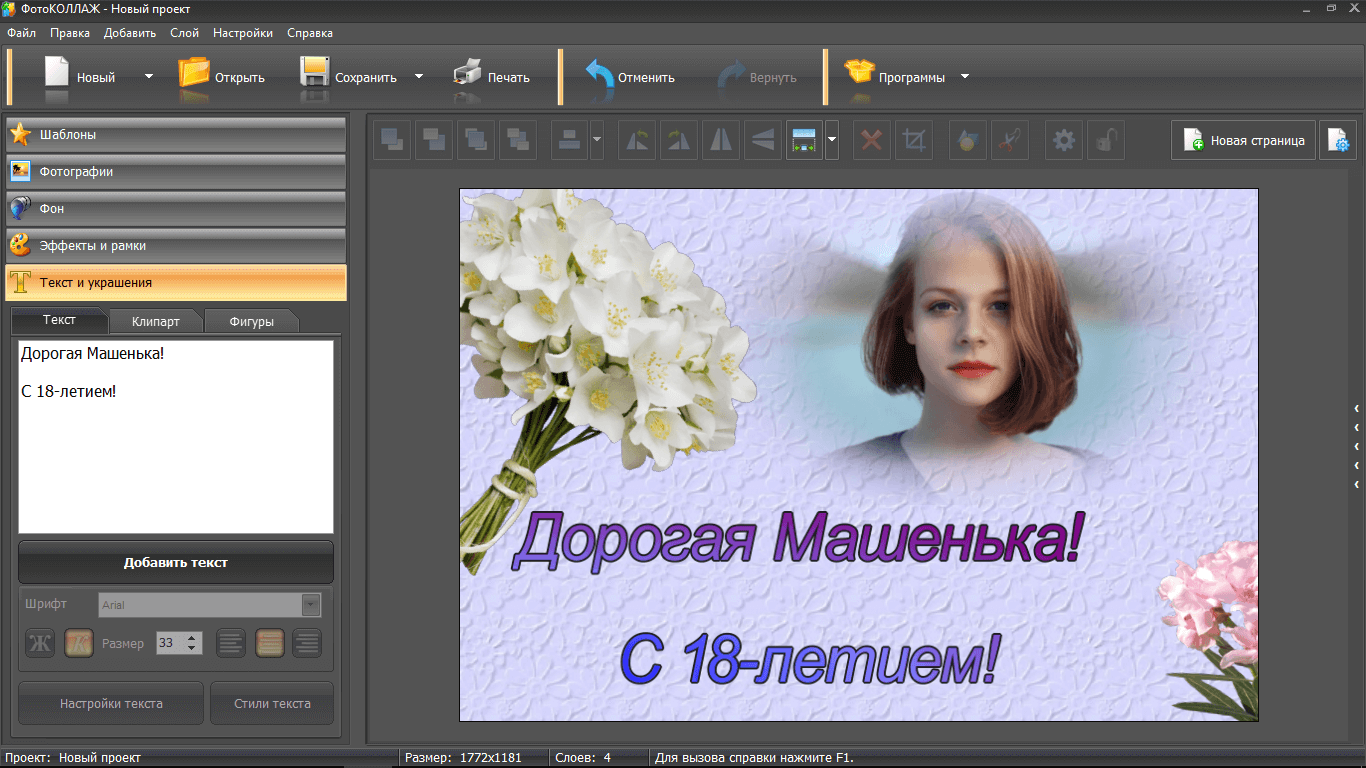 Текст часто является необходимостью, особенно если вы делаете коллаж на юбилей или другой праздник. Преимущество ФотоКОЛЛАЖа в том, что все шрифты доступны в русскоязычной версии. Только представьте, что не нужно судорожно перебирать разные варианты, чтобы найти тот, который прилично выглядит при написании текста на русском языке.