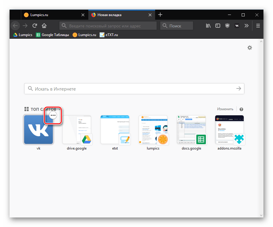 - Наведите курсор мыши на блок с сайтом, который нужно удалить, кликните на иконку с тремя точками.