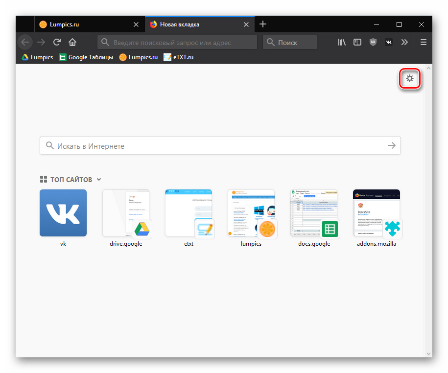 - Создайте в браузере новую вкладку и в правом верхнем углу страницы щелкните по иконке с шестеренкой, чтобы открыть меню настроек.