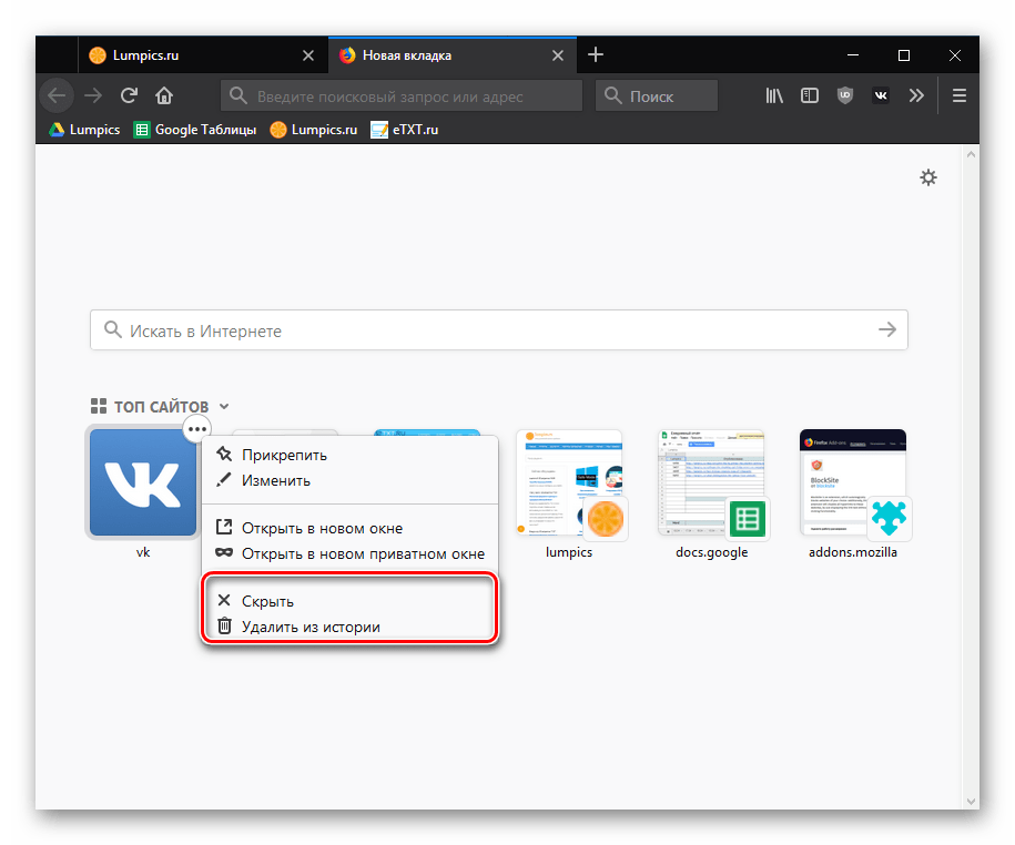 Способ 2: Удаляем/скрываем сайты из «Топ сайтов»
