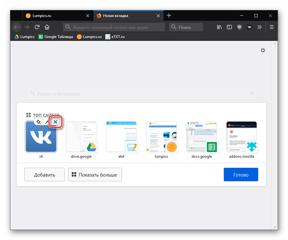 Теперь наведите курсор на сайт для появления инструментов управления и нажмите на крестик. Это не удаляет сайт из истории посещений, но скрывает его из топа популярных ресурсов.
