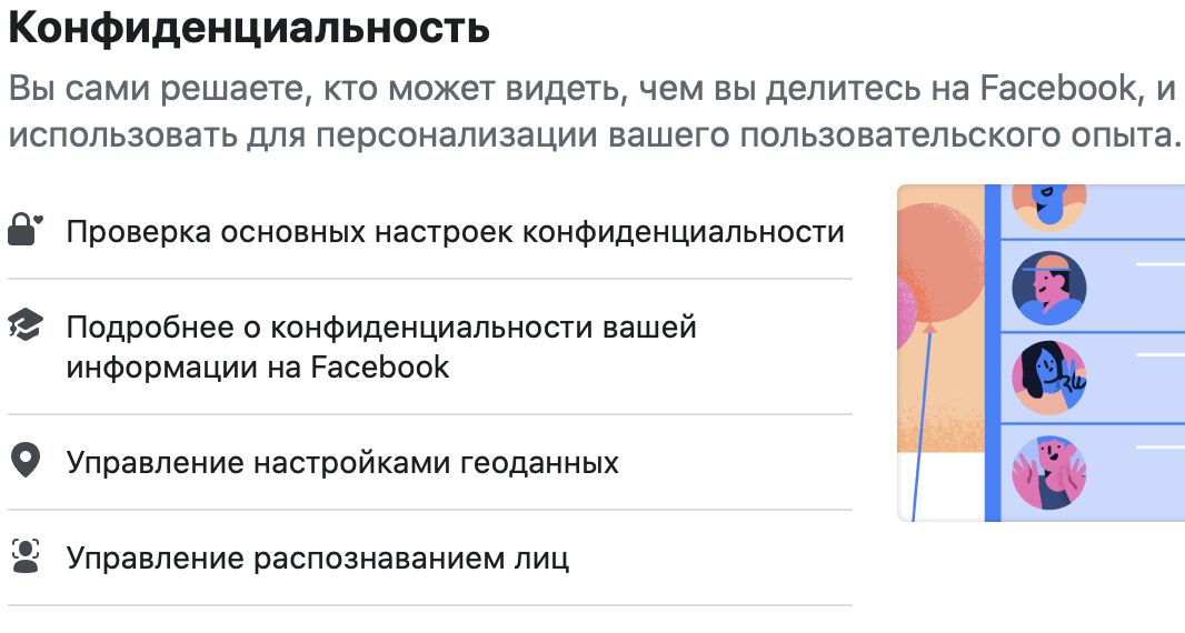 «Настройки и конфиденциальность» → «Быстрые настройки конфиденциальности» → «Конфиденциальность» → «Проверка основных настроек конфиденциальности» →