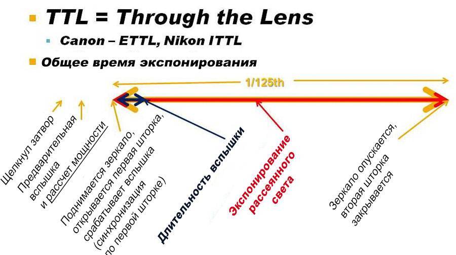 Такой прием называется Синхронизация по первой шторке (и обычно является настройкой по умолчанию для многих камер). Затем экспонирование продолжается, сенсор получает рассеянный свет пока не выйдет время. При работе в режиме TTL делается предварительный импульс, благодаря которому камера рассчитывает мощность вспышки. На схеме ниже изображен процесс экспонирования при выдержке 1/125 секунды.