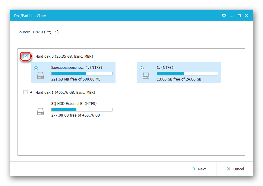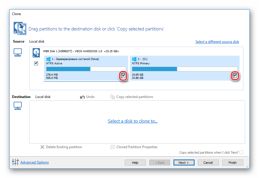 В открывшемся окне поставьте галочку рядом с тем диском, с которого нужно произвести клонирование. Вместе с этим автоматически будут выбраны все разделы.