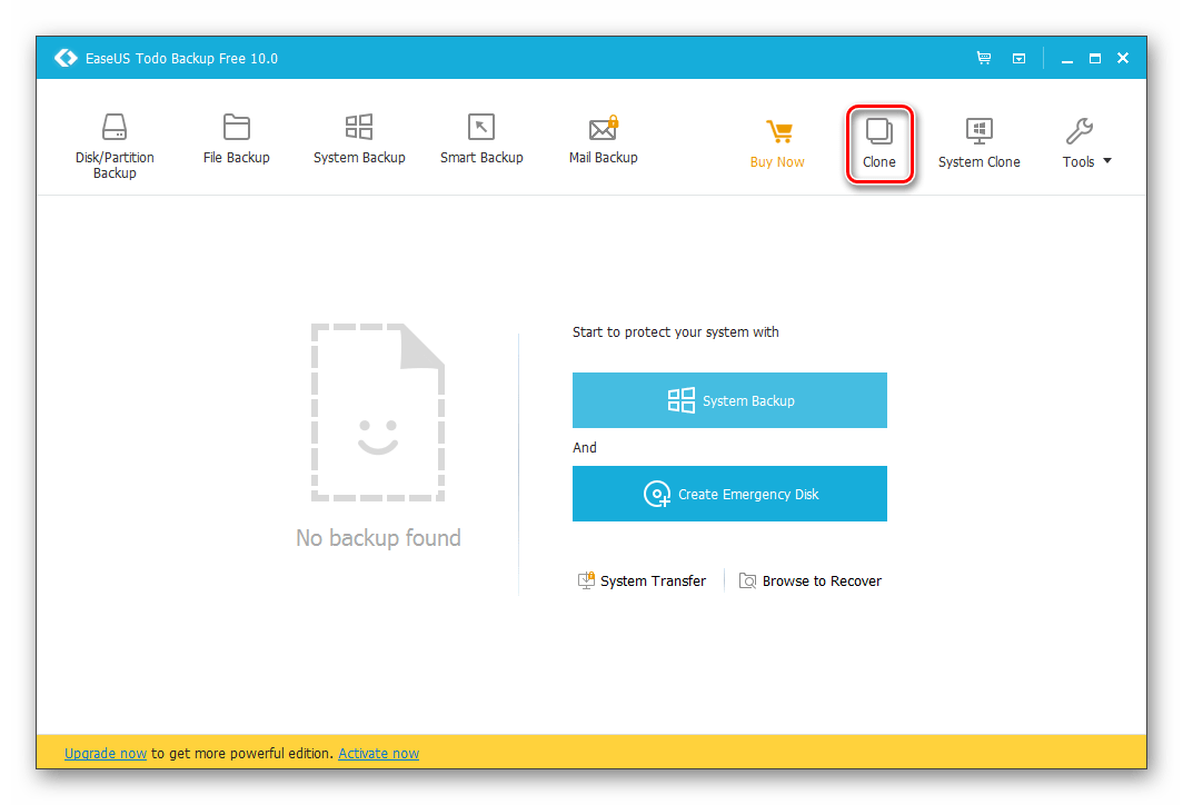 - В главном окне EASEUS Todo Backup нажмите на кнопку «Clone».