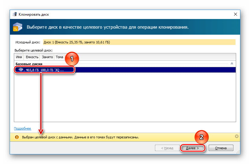 В окне клонирования выберите накопитель, на который будет производиться клонирование, и нажмите «Далее».
